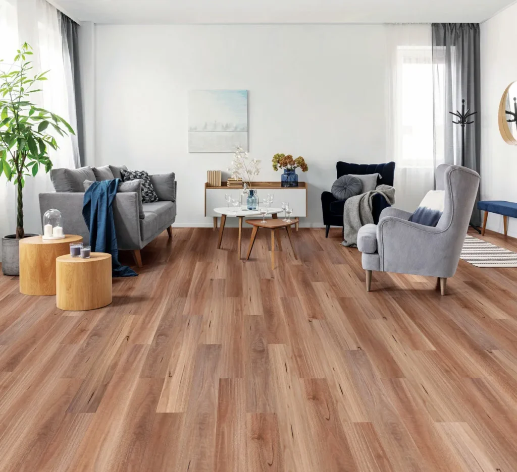 Duraplank XL was meticulously crafted to elevate the aesthetic appeal of your flooring. By integrating multiple extra-large print films to significantly reduce repetition, it ensures a more organic and unique appearance from plank to plank. The advanced print film technology captures the intricate details and natural variations found in real timber, providing a visually stunning and authentic look. Natural Oak is a perennial favourite among designers and homeowners, celebrated for its timeless beauty and classic charm. Its distinct grain pattern adds a sophisticated touch, providing a neutral yet character-rich base that enhances any room. The versatility of Duraplank XL’s Oak designs is evident in the range of shades, from light to dark, allowing for great flexibility in design. This adaptability makes this range an excellent choice for complementing a wide variety of colour schemes and design trends, from modern minimalism to rustic elegance. Its natural warmth and inviting tones create a welcoming atmosphere, making it suitable for both residential and commercial spaces. Australian timber designs are highly prized for their unique characteristics and aesthetic appeal, with standout species like Spotted Gum and Blackbutt leading the way. These timber designs are particularly favoured for their distinct grain patterns and rich colour palettes, which add a dynamic and sophisticated touch to any space. Their versatility allows them to seamlessly integrate into various design trends, from modern minimalism to rustic charm, ensuring a timeless and captivating aesthetic. Duraplank XL’s Australian timber designs are the ideal choice for both contemporary and classic interiors in residential and commercial settings, offering both beauty and durability.
